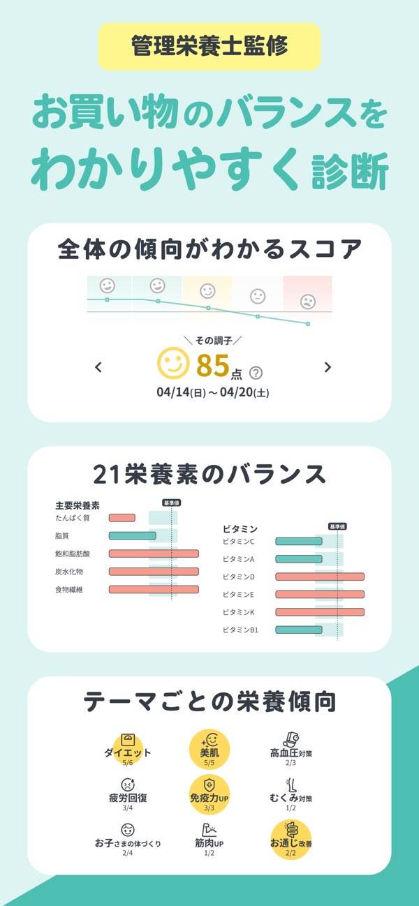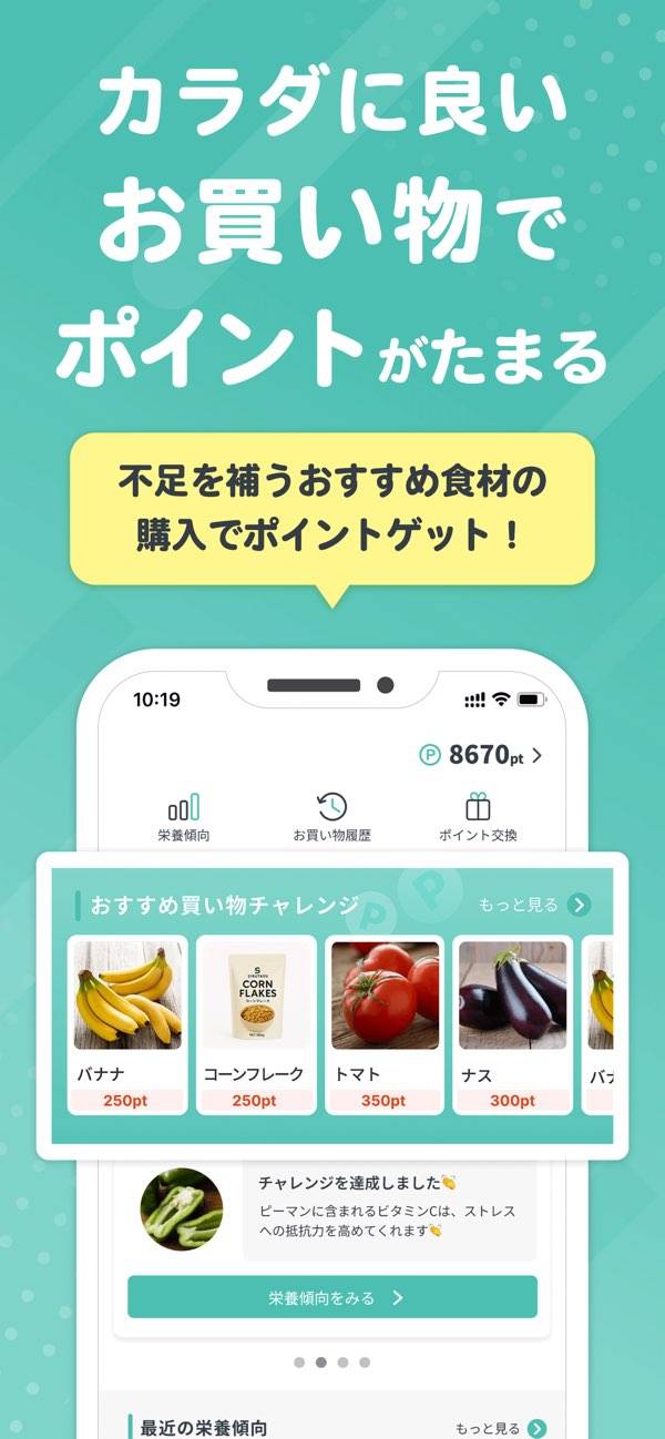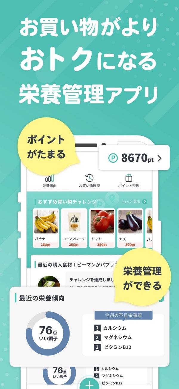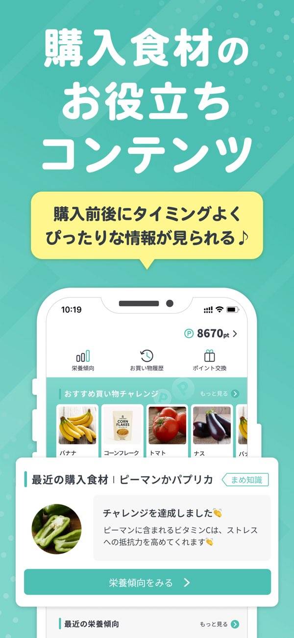 また指定の食材を購入することで、ポイントをゲットできる機能も搭載。健康的な食生活を取り入れながら、お得な買い物にもつなげられる魅力満載のアプリです。