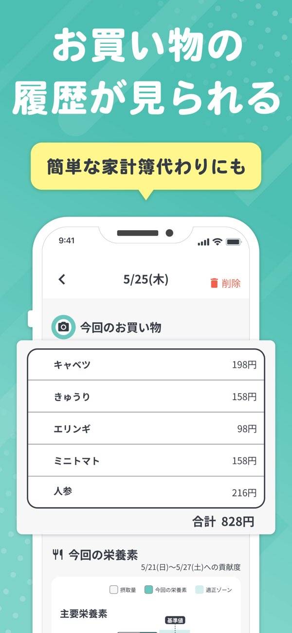 購入した食材のデータをもとに、栄養不足を補う提案をしてくれるアプリ。食材の登録はレシートをスマホのカメラで撮影するだけなので、手間なく利用できます。