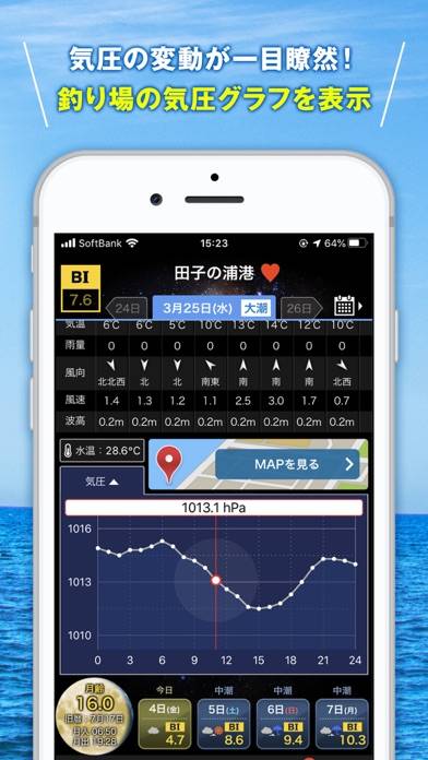 4,000ヵ所の釣り場における、潮の精密なデータがひと目でわかります。目的の場所を選ぶだけで、潮の満ち引きをリアルタイムで把握。直感的なUIで必要な情報がコンパクトにまとまっており、初心者からベテランまで誰もが簡単に操作可能です。