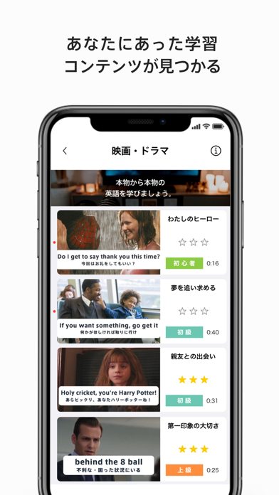 映画やドラマのワンシーンがそのまま英語学習素材として使えます。登場人物の口調や間のとり方に合わせて真似するシャドーイング方式なので、ネイティブの自然な表現を習得可能。「こんなとき英語で何て言うの?」が実感として覚えられ、すぐに使える表現が増えていきます。