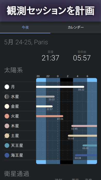 日付や場所を選んで夜空をシミュレーションする機能もあり、特定の天文イベントの観測計画に便利です。天体観測初心者にとって、手軽に星の世界を楽しむ最適なツールでしょう。