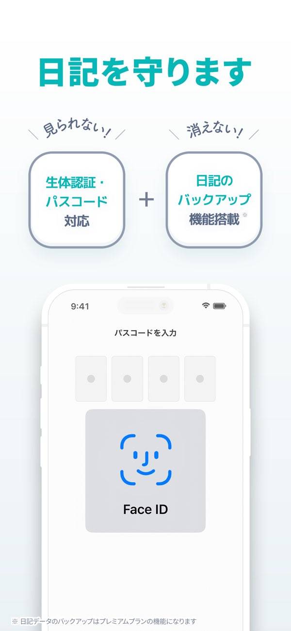 - 顔認証やパスコードでロック。誰にも見られたくない日記も安心