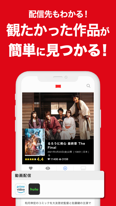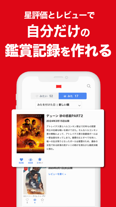 - 観た映画の星評価とレビューを残せる。映画ノート的な使い方が可能