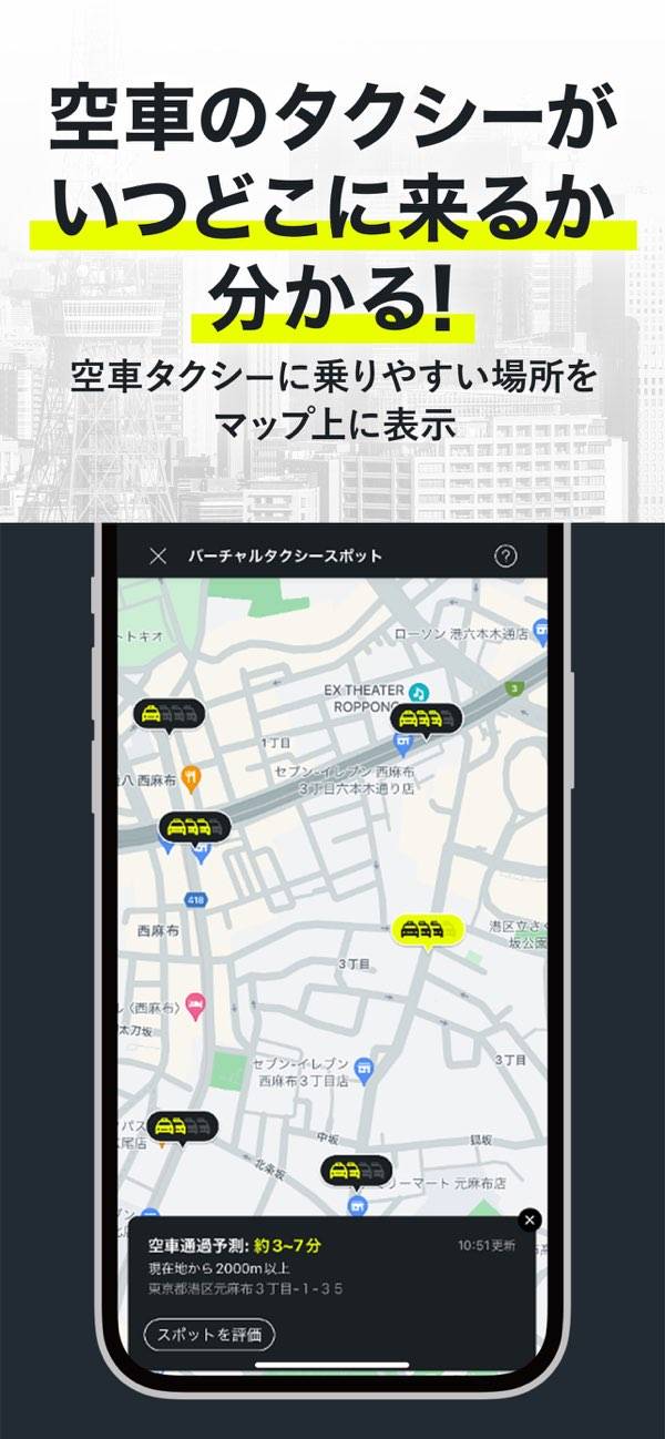 現在地周辺にどのくらいでタクシーが到着するかが、アプリ内の地図で表示されます。移動経路を調べる必要もなく、道路状況を見ながらスムーズな出発準備が可能です。