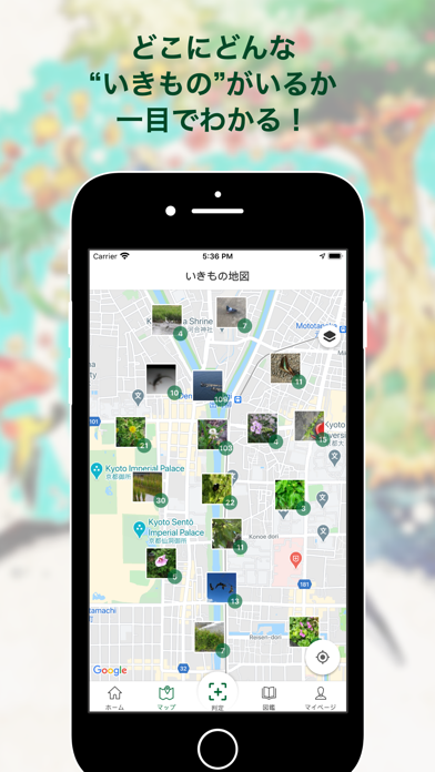 ユーザーの投稿から、近くにどのような生き物がいるかがわかります。地図上に写真が撮られた場所が表示されるので、実際に見に行くことも可能。新しい発見が待っています。