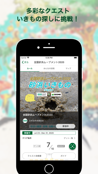 指定された植物や動物の写真を集めていくクエスト。「季節の花の写真を5枚撮る」「ツバメを投稿する」など、季節に合ったクエストが複数用意されています。クエストを行うことで、自然に生き物についての知識が深まります。