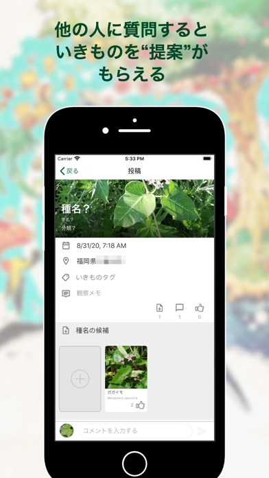 写真を撮って投稿することで、ほかのユーザーとの交流ができます。いいねをつけたりコメントをしたり、時には質問に答えてもらったり。生き物に興味を持つユーザー同士の交流の場所として最適です。