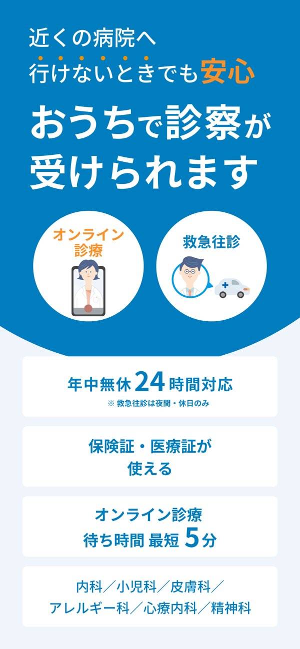 訪問医療、またはオンラインで診察を受けられるサービス。特に夜間や休日、体調が悪くて外出できないときでも、安心して医療サービスを利用できるのが最大の特徴です。診察料は保険適用なので経済的な負担も軽減されます。急な健康問題に対応したいときにおすすめです。
