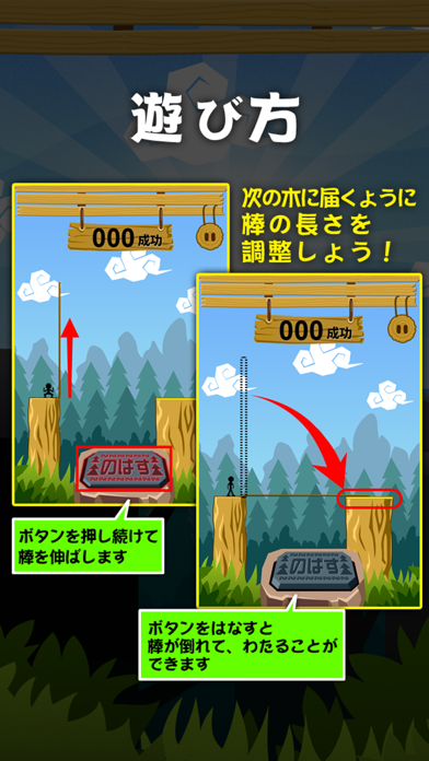 ゲームの内容は、棒を伸ばして先にある丸太に掛けるというシンプルなものです。