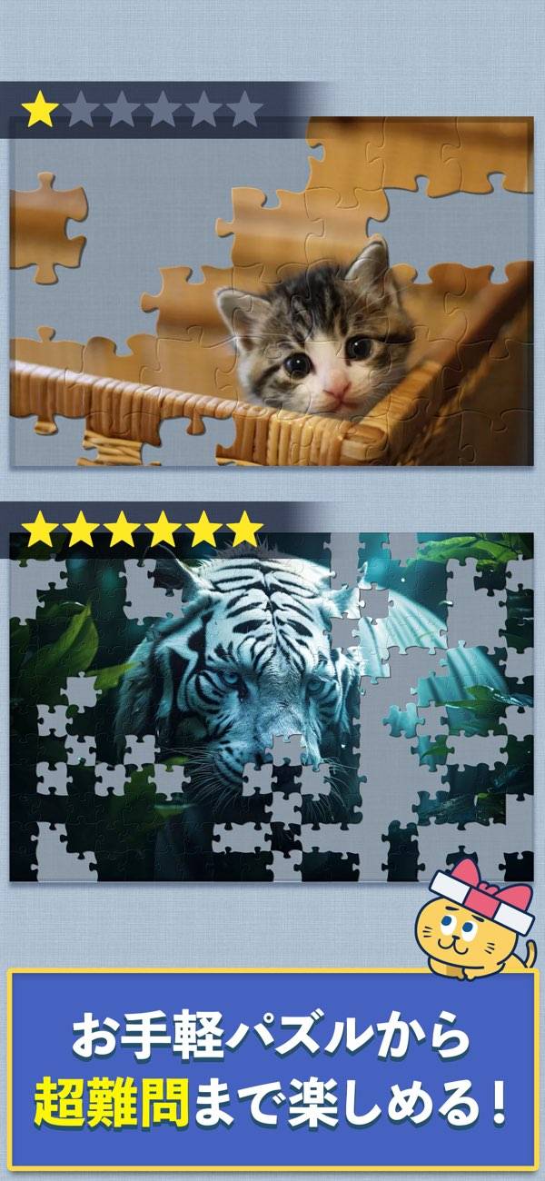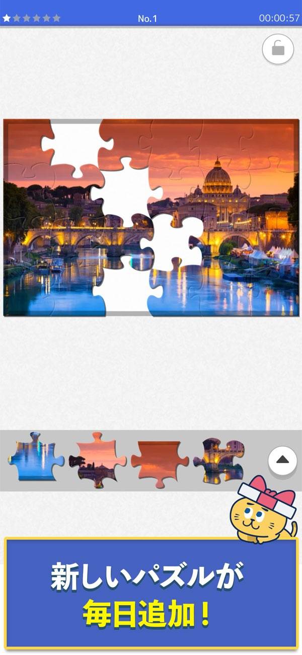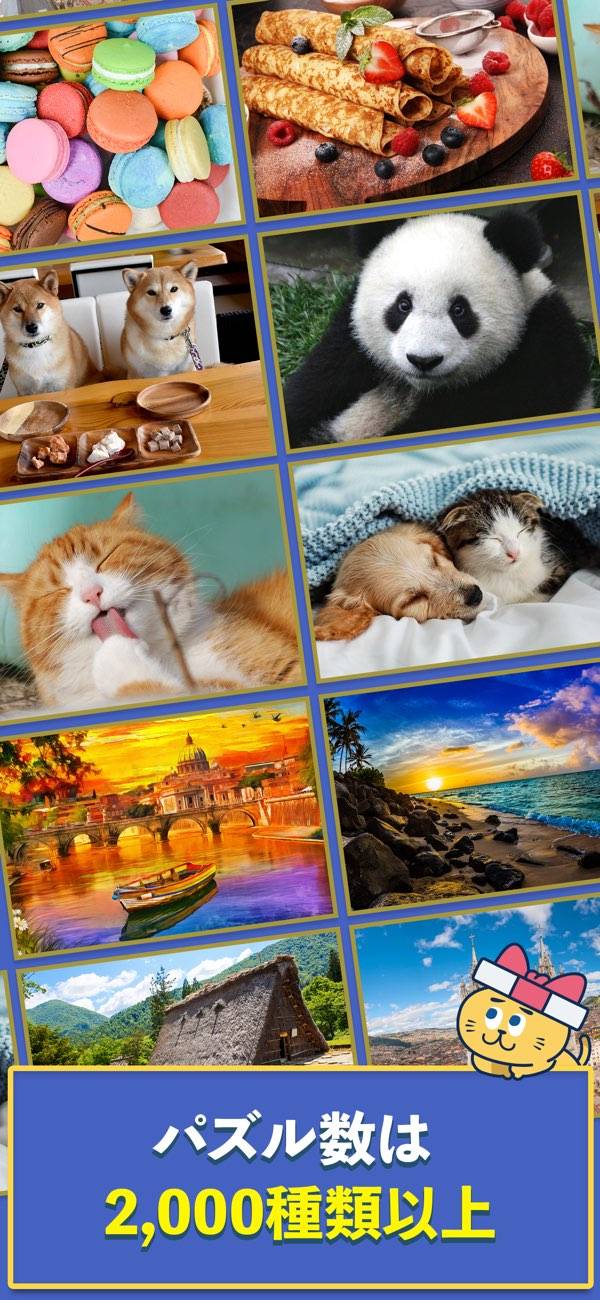 ジグソーパズルに挑戦できるアプリです。2,000種類以上のパズルを楽しみながら、懸賞にも応募できるのが大きな特徴です。美しい風景やかわいらしい動物はもちろん、完成図が隠された難問パズルまで幅広く種類が用意されています。
