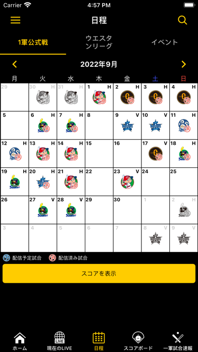 今後の試合日程がカレンダーに表示されており、見やすいのが特徴です。また過去の試合スコアもチェック可能。一軍の公式戦とウエスタンリーグどちらもカレンダーに表示されています。