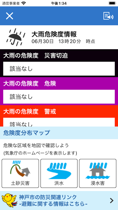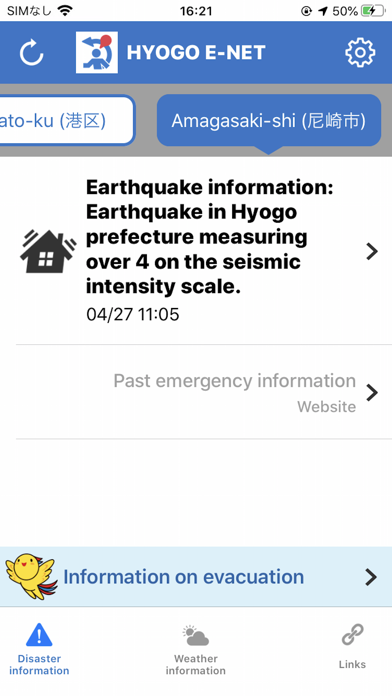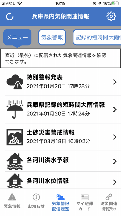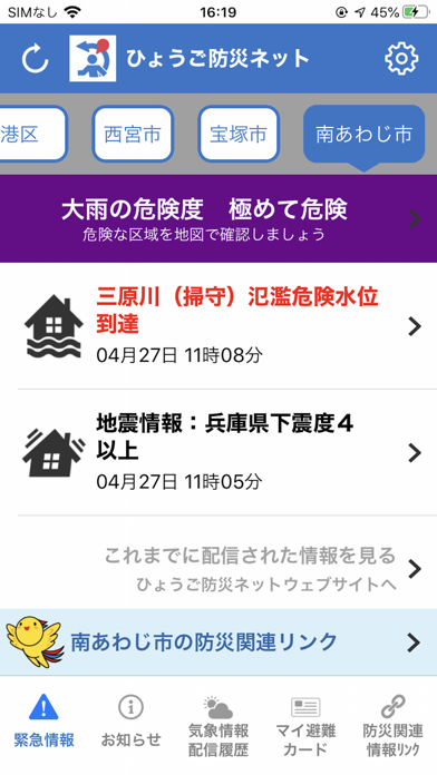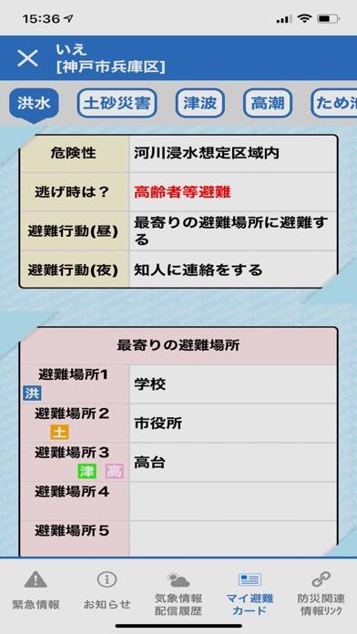 - 災害発生時に緊急情報を通知してくれる。自宅や現在地を設定可能