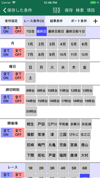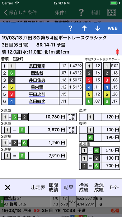 膨大な情報量が本アプリ最大の魅力と言ってもいいでしょう。グレード、ボートレース場、展示進入、天気、着順など70項目を設定し、条件に合うレースを即座に探し出せます。