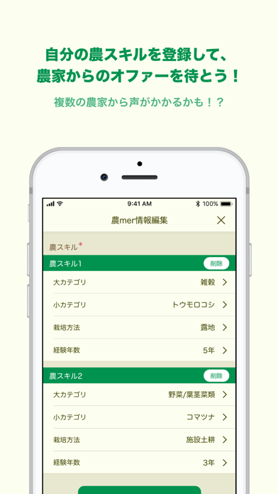 ▲まずは農業経験やスキルなど農家の方へアピールできるポイントを登録。自分をしっかり売り込もう。