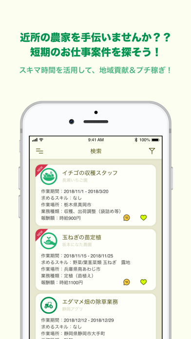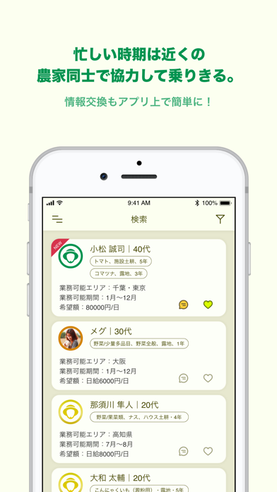 農家と人材を繋ぐサポートをする本アプリ。求職者側が農家を探すだけではなく、農家側からも優秀な人材に対してアプローチできる仕組みになっています。マッチングの可能性を高めるためには、プロフィールを充実させておくことが重要に。