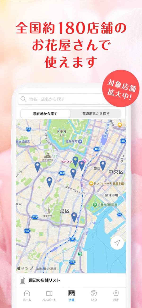 クレジットカードでパスポートを購入し、毎月決まった分のお花を店舗で受け取れます。全国230店舗以上で使用でき、アプリ内で現在地から近い店舗、営業時間を検索できるのが特徴。そのほかにもギフトサービスもあり、大切な人にプレゼントできるのも嬉しいポイントです。