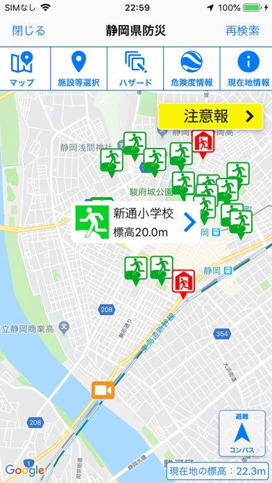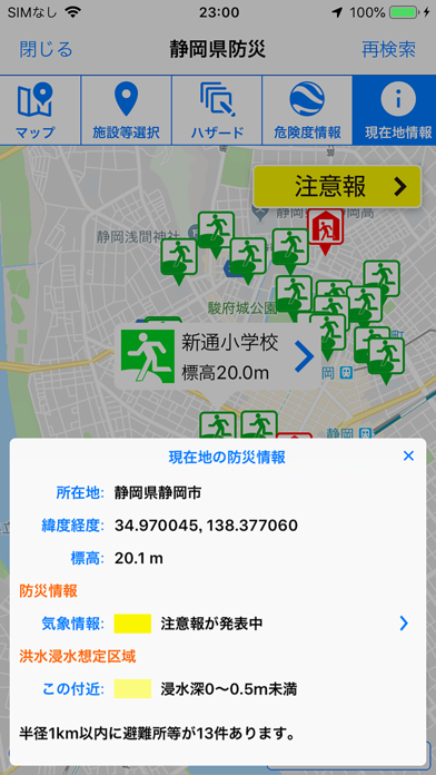 - オフライン対応のハザードマップを搭載。避難所の表示・案内機能もあり
