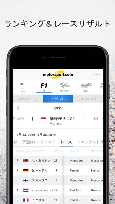 F1やMotoGP、スーパーGTなど、多種多様なモータースポーツ情報を提供。ニュースや写真、ビデオ、リザルト、ランキング表といった情報を一手に扱っています。これにより、モータースポーツに興味がある人は、一つのアプリでさまざまな情報を得られます。