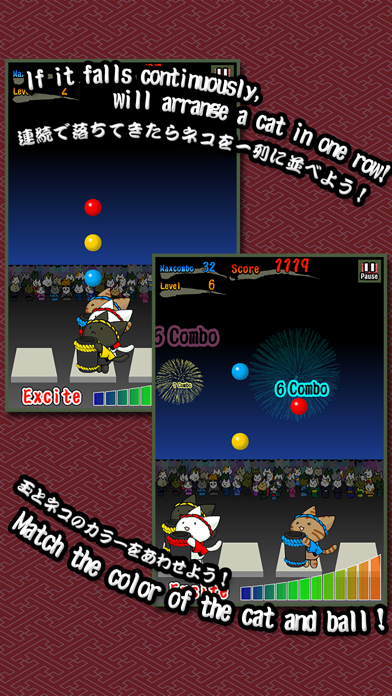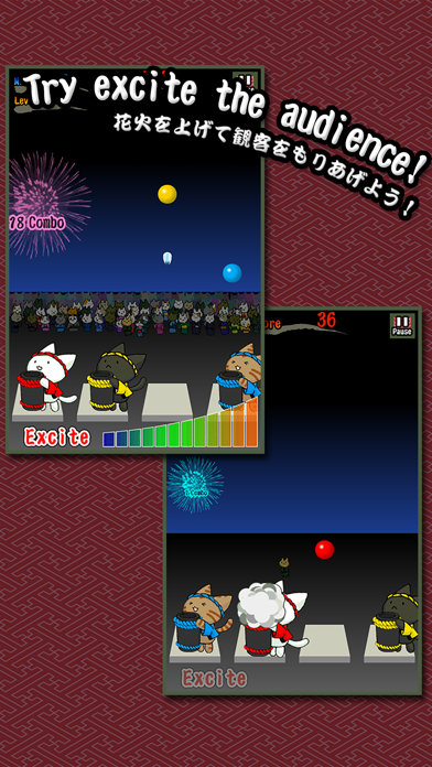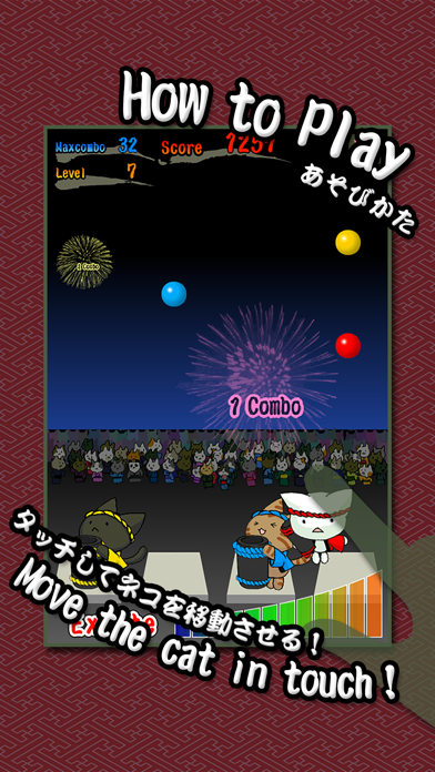 夏の風物詩の1つ花火を猫達が打ち上げるというちょっと可愛いゲーム。3色の鉢巻をした3匹の猫を動かして、落ちてくる花火の玉を上手にキャッチして打ち上げるというものです。花火の玉は3色あるので、赤い鉢巻をした猫が赤い玉を、青い鉢巻をした蒼い玉をキャッチしなければなりません。見事打ち上げる事が出来ればExciteバーが上がり、会場が興奮状態に!逆にうっかり落としてしまったり、間違った色をキャッチすると観客が減ってしまい、会場は盛り下がります。ゲージが0になるとゲームオーバー。その時点でのスコアを競うというゲームです。一生懸命玉をキャッチする猫の姿は必見!夏はもちろん冬でも楽しめる可愛らしいアプリです。