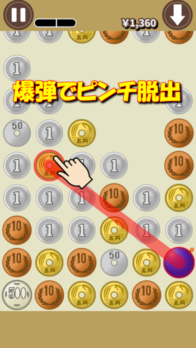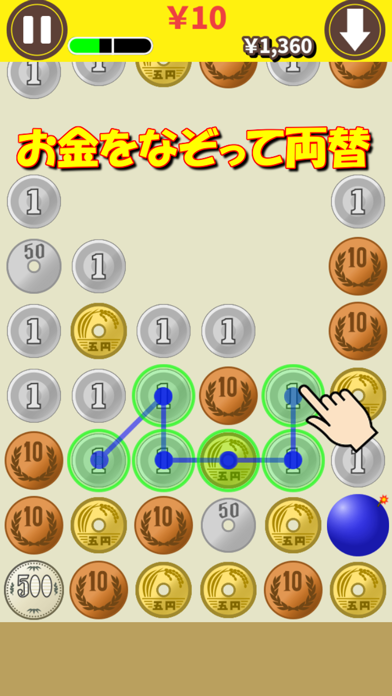硬貨を繋いで、より大きな硬貨を作っていくシンプルパズル