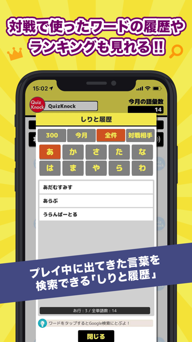 持ち時間2分の超スピードしりとり。相手が持ち時間0になれば負けなので、単語数の少ない「る」などを末尾に置いて相手を困らせるのも戦略です。対人戦ゆえの駆け引きが楽しめます。