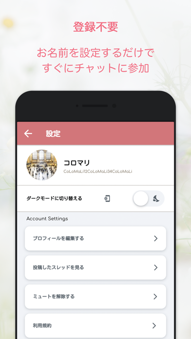 プライバシーを守りながら、手軽に交流を楽しめる雑談アプリです。登録は一切不要で、ハンドルネームを設定するだけで気軽にチャットが始められます。