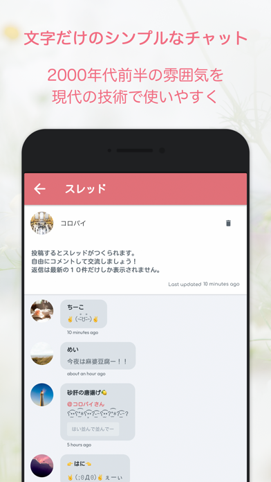 本アプリでは、特定の話題に特化したスレッドを作成できます。話したい内容についての説明文を入力するだけで、手間なく作成可能。またほかの人のスレッドに参加することもできます。恋愛・旅行・グルメなど、共通の話題を持つ人と盛り上がれます。