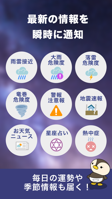 防災と天気予報がひとつになったお天気アプリ。大雨や地震などの災害の危険度が高まったら、直ちに通知でお知らせします。さらに紫外線や洗濯指数など、日常生活に役立つ情報も提供。拡張現実(AR)機能で、キャラクターが現実の世界を駆け回り、天気の移り変わりを楽しく伝えます。