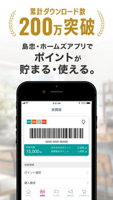 会員登録するとアプリ会員証が発行されます。島忠ホームズだけでなくニトリでのお買い物でもポイントを貯められ、貯めたポイントでさらなるお買い物が可能。購入履歴もチェックできるため、再購入時には前回の情報を簡単に参照できるでしょう。