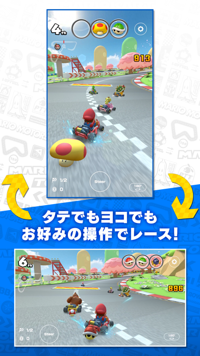シンプル操作の片手で楽しめるマリオカート。アクセル操作はもちろん、ジャンプ時のジャンプアクションやドリフトもすべてオートで行ってくれます。