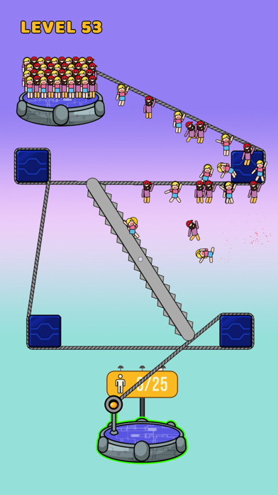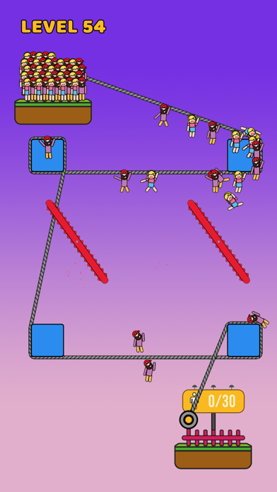 障害物に注意しながらロープをゴールにつなぎ、人々を誘導します。画面長押しで人々がロープを渡るので、タイミングが大事。ノコギリなどに当たってしまわないか、ちょっとしたスリルが味わえます。