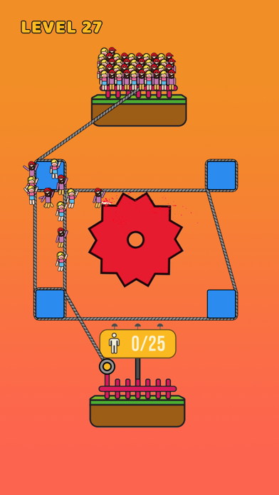 ロープを引っ張り人々をゴール地点へ運ぶパズルゲーム。道中には危険な回転ノコギリが……。ぶつかってしまうと血みどろで悲惨なことになります。1人もかけずに、あなたは罠だらけのステージを進めるでしょうか?