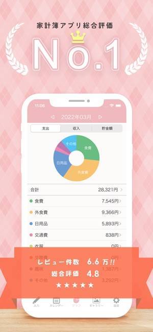 - 収支は自動でグラフ化。費目の割合や貯金額の推移がわかる