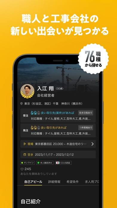 最近、建設関係の個人事業主になり仕事を受注するため、このアプリを使い始めました。自分の空いている日程をプロフィールに記載できたり、自分の求める現場を見つけたりととても便利なアプリだと思いました。求人情報もあったので、もしまた会社に入りたいと思った時も使いやすいと感じています。