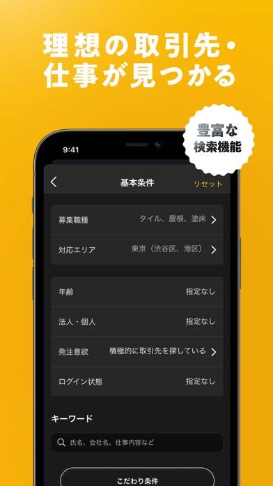 70種類以上ある職種を選択し、対応エリアや経験年数など細かく設定可能。そのためあなたが探している受発注者を、探しやすいアプリです。正社員の求人や現場探しも可能なので、あなたのスキルを活かして仕事探しをしてみてください。