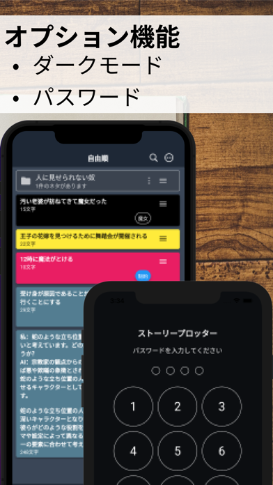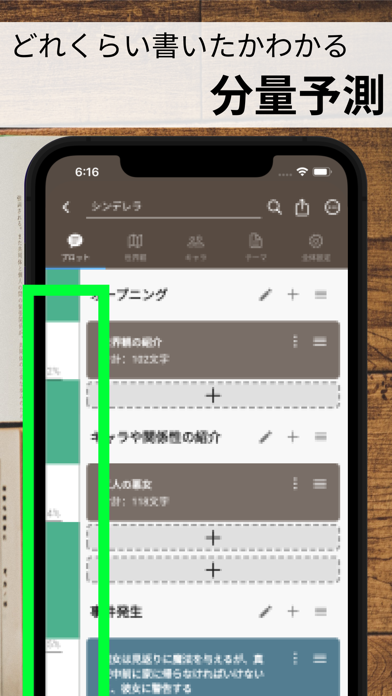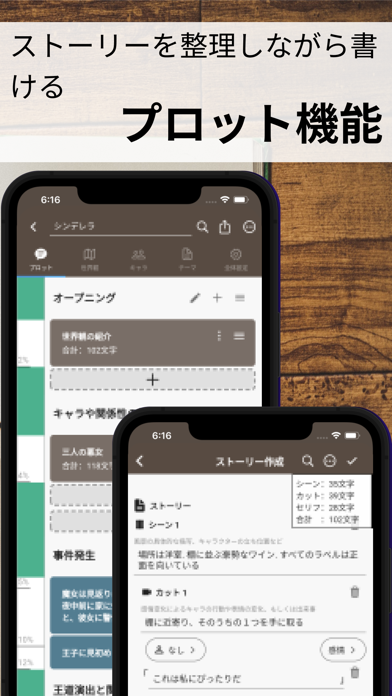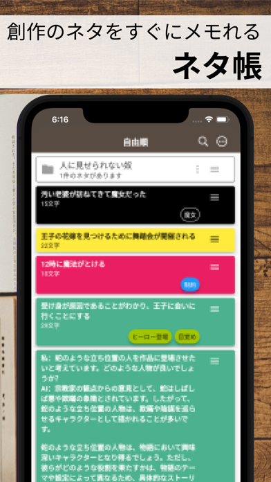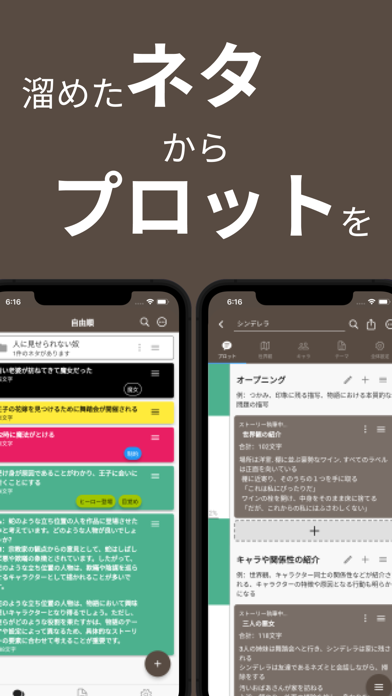 ネタをまとめておいたり、プロットを作成したりできるアプリです。ネタ帳とプロット帳はそれぞれ画面下部のアイコンで切り替えられるので、スムーズに作業を行えますよ。