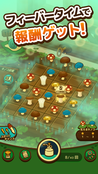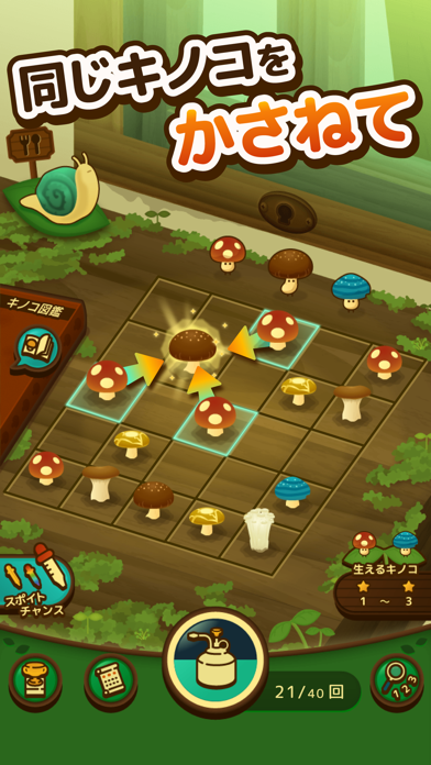 森の中にひっそりと生える色とりどりのキノコたちを育てるパズルゲーム。同じ種類のキノコを3つ以上くっつけて、新しいキノコを生み出ていきましょう。霧吹きで水を与えキノコから得たエネルギーで新しい仲間を解放することで、ゲームのバリエーションが増し、飽きずに長く遊べます。