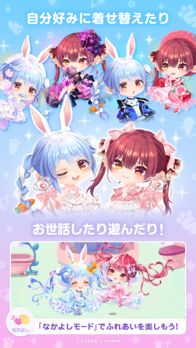 2人のキャラクター“ココロン”を自由に着せ替えて遊べるアプリ。最初からさまざまなアイテムが用意されているほか、お世話をすると新しいアイテムを手に入れたり、限定アイテムが出るガチャのポイントを貯めたりもできます。キャラクターが2人いるので、それぞれで違った方向性のファッションを楽しめるのが魅力です。