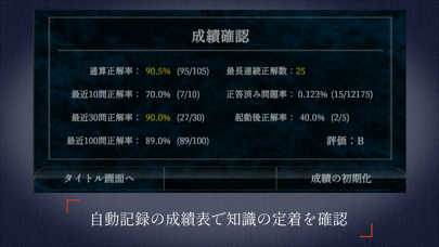 通常練習で正確性を身につけた後は、5問・10問のタイムアタックで計算速度アップを目指しましょう。制限時間内に正解を導く練習により、対局中の素早い判断力も養えます。通算正解率、最近30問の正解率、最長連続正解数など、詳細な成績データで自分の上達具合を客観的に把握可能です。