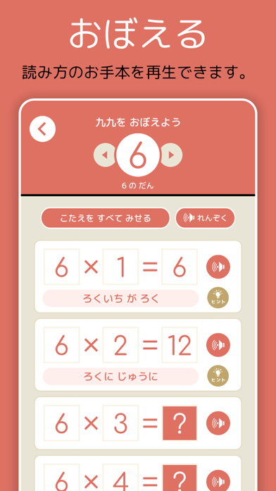 - 音声の再生機能もアリ。まずは九九の暗記から始めて、勉強をサポート