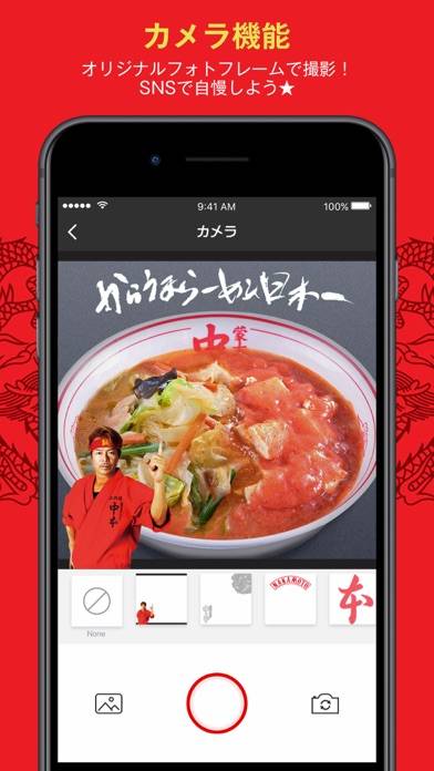 基本的な店舗検索やテイクアウト注文のほか、カメラ機能も搭載。オリジナルデザインのフレーム、ステッカーを貼り付けて写真が撮れます。ラーメンを食べる前に撮影したり、店舗に来た記録用に撮影したりと、いろいろなシーンに使えそうです。