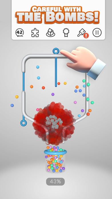 ピンを抜いて、カラフルなボールをガラス瓶にすべて入れるとクリア。爆弾が設置されているステージもあり、うっかり爆弾をガラス瓶に落としてしまうと割れてゲームオーバーに。どの順番でピンを抜くと回避できるか、時間を忘れるほどじっくり考えて遊んでしまいます。