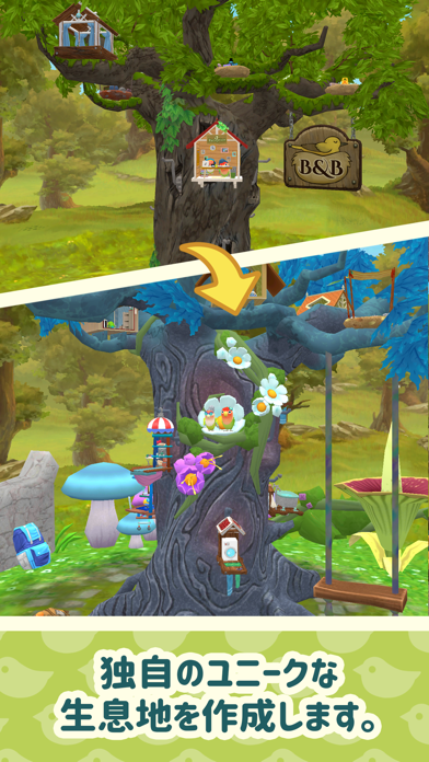 鳥たちは、首をかしげたり毛づくろいしたりと表情豊か。ぼーっと見ているだけでも癒やされること間違いなし。またカスタマイズ機能も充実しており、ツリーの見た目や巣箱のデザインも変えられますよ。