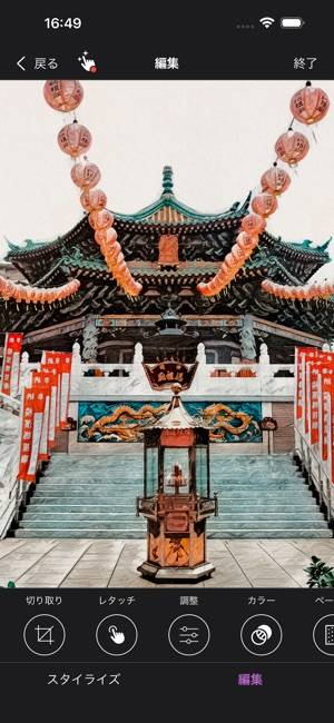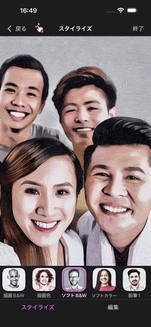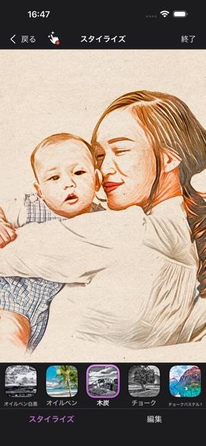 - 鉛筆画やスケッチ風など加工の種類が豊富で、どれもワンタップで簡単に使える
