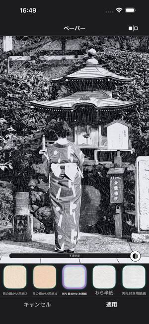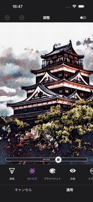 フォトライブラリから画像を選ぶだけで、鉛筆スケッチやチャコール画、パステルタッチ風などに加工できます。タップ一つで画像を加工できるので、編集に慣れていない人でもサクッと使用可能。旅先の風景や大切な思い出が、1枚の手描きイラスト風の作品としてよみがえりますよ。