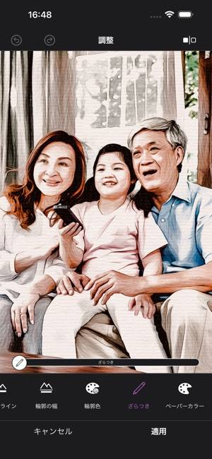 アウトラインや線の濃さを微調整できるので、自分の好みにぴったり合ったスタイルに仕上げられます。Apple Pencilにも対応しており、不要な輪郭の削除や細部のリタッチも自由自在。組み合わせ次第で、まるで手描きのような個性的な作品が完成します。