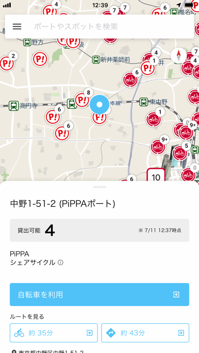 現在地から近いポートを探すもよし、自分が会員になっている業者のポートを探すもよし。ルートも検索できるので、借りる時や返却する時の道のりも迷いません。
