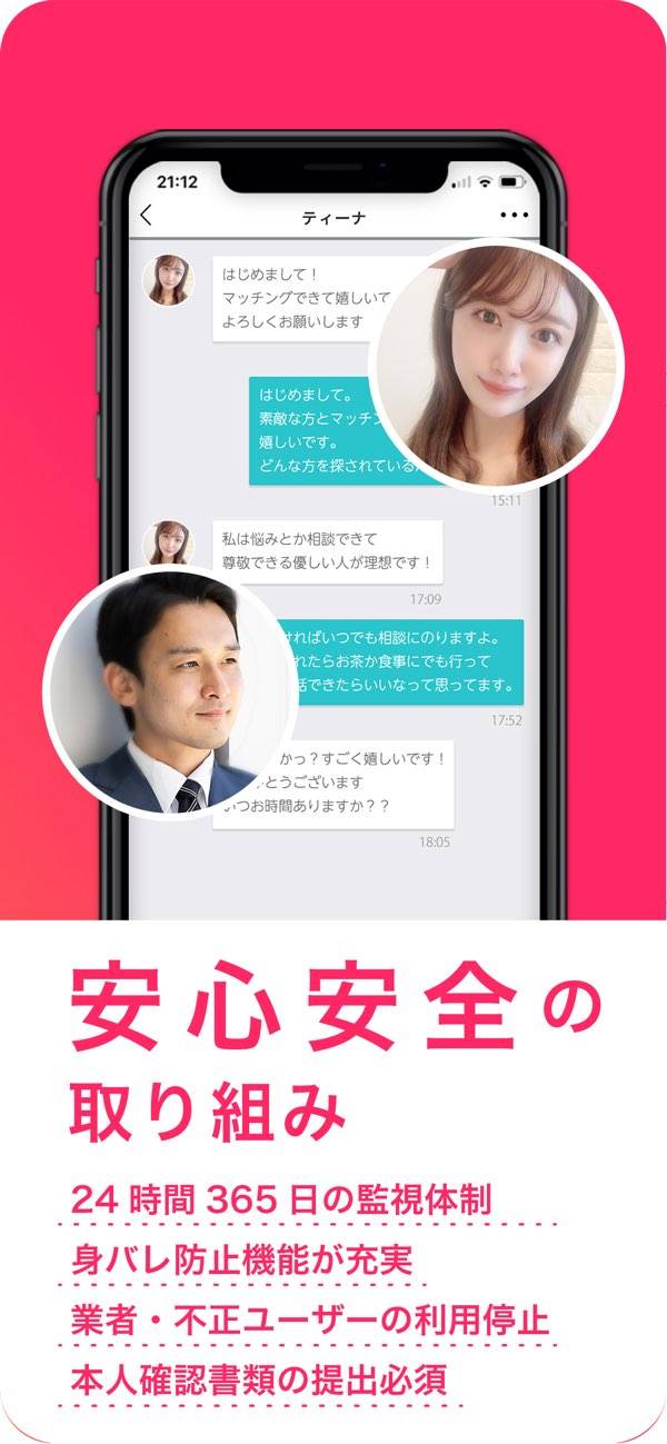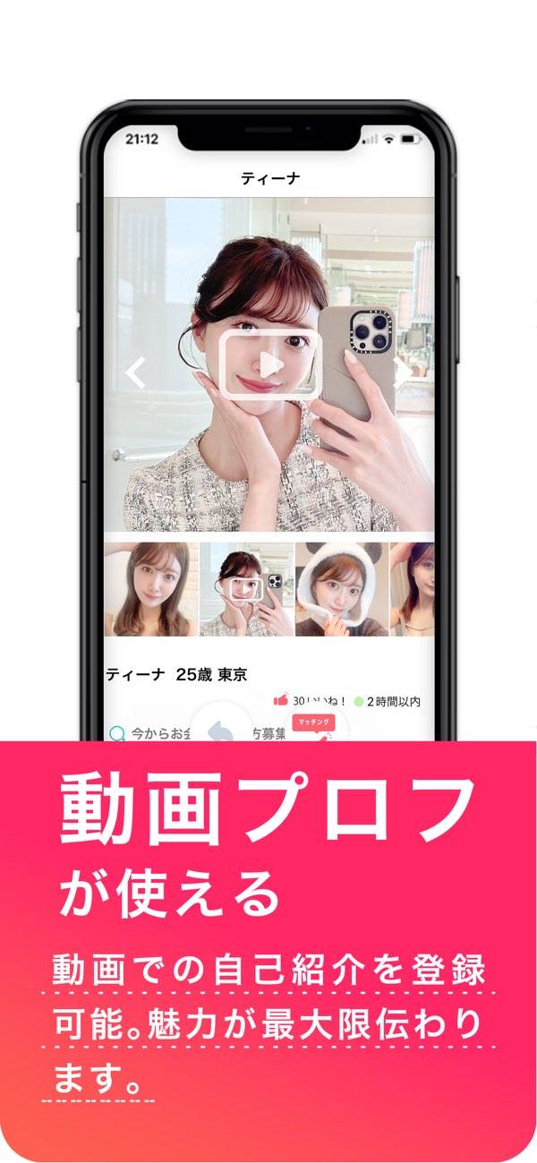 動画を使って魅力を伝えられるマッチングアプリ。文章だけでは伝えられない魅力を伝えられるため、あなたの人柄を見てもらいやすいです。また運営側が安全対策にも力を入れており、相手の違反の有無をチェックできたり、24時間365日フルで監視していたりと、安心して出会いを探せます。