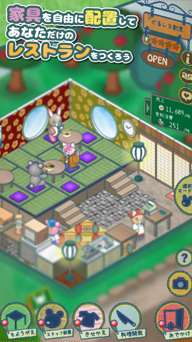 可愛いぬいぐるみ達が各々のペースでレストラン経営してる様子が可愛いです。操作がっつりやるというより、動いてる様子を眺めるのが好きな方向け。