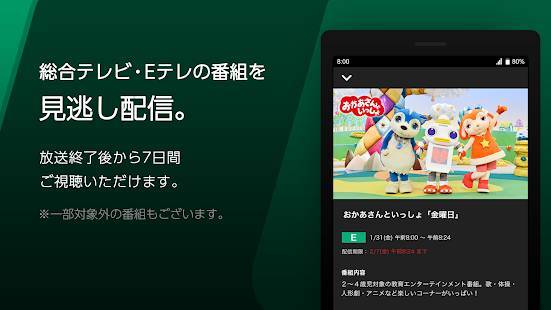 - NHK総合とEテレの番組を放送。1週間の見逃し配信も見られる